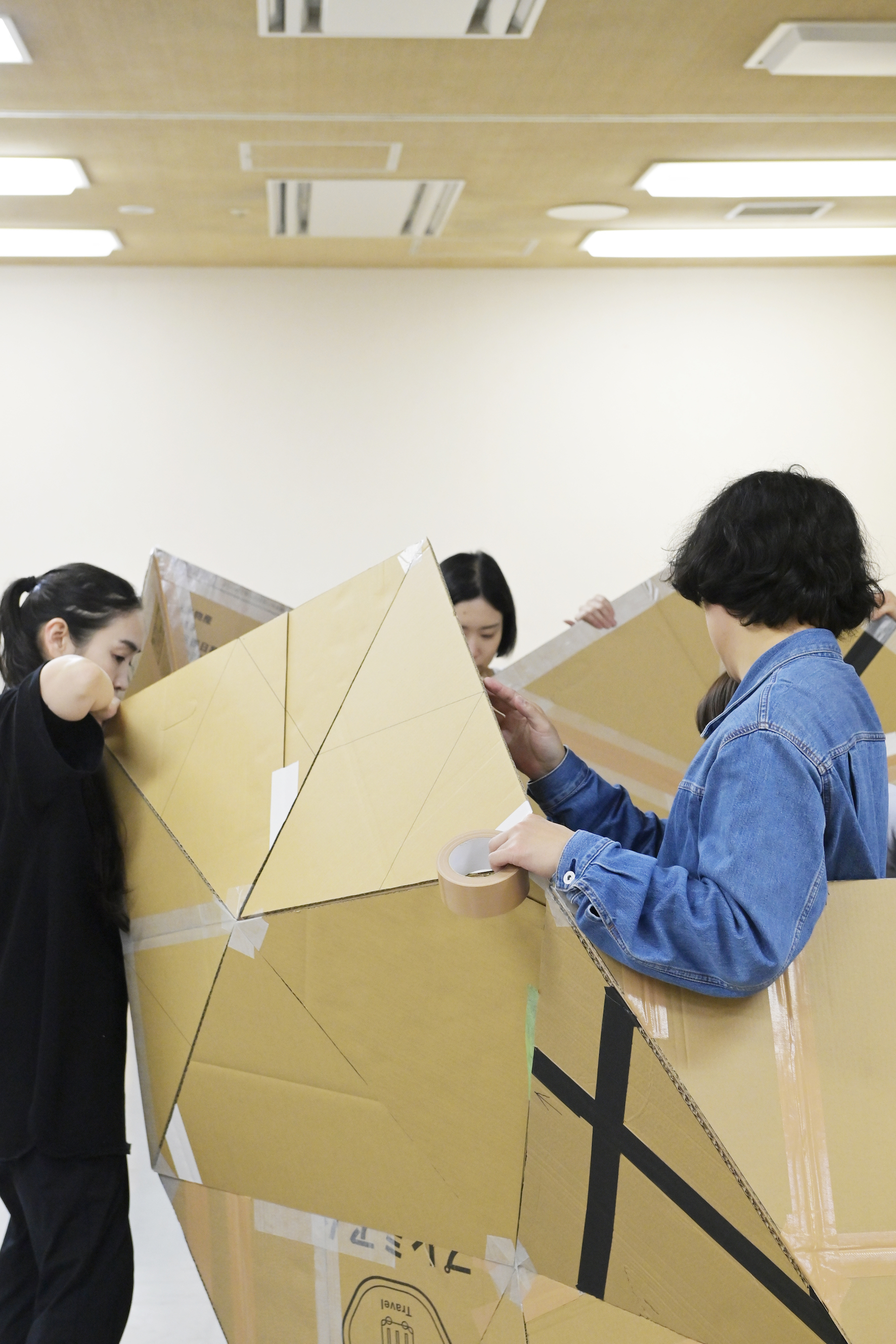 この三角形を組み合わせて、五角形と六角形を作るんだけど――今日はとりあえず、ガムテープで貼り合わせてみよう。端っこを養生テープで補強しておいて、その上からガムテープで貼り合わせる。本番では何で留めるかってことは、稽古を進めながら考えよう。